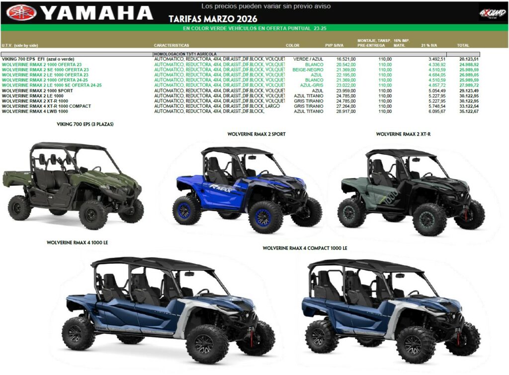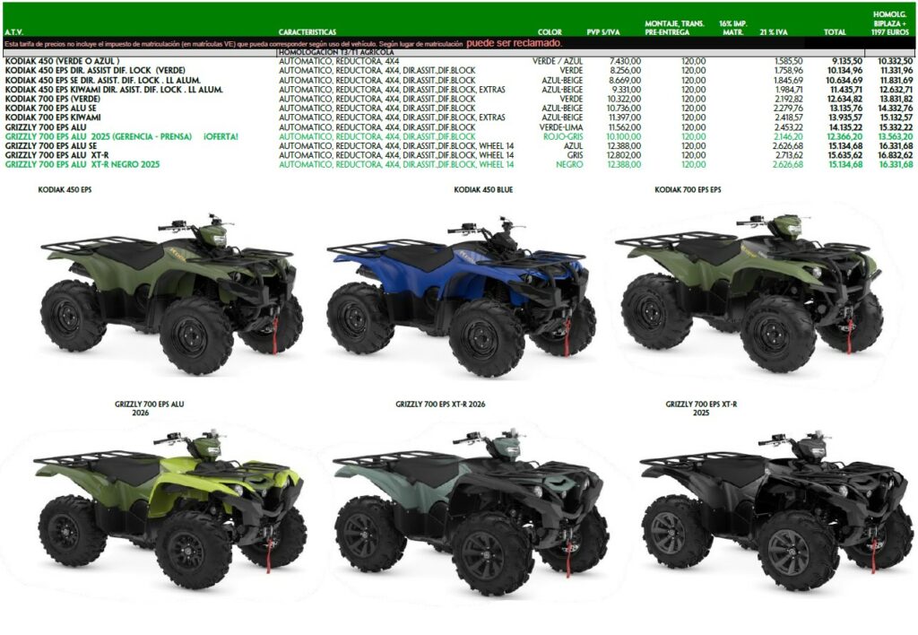 Aquí puedes ver el precio actualizado de los vehículos YAMAHA. Recordamos que en la tarifa de precios no está incluido el impuesto de matriculación COMO VEHÍCULO ESPECIAL (PLACA VE) que puede ser reclamado según el uso del vehículo en alguna comunidad o delegación de hacienda. Solo incluimos el impuesto en los quads deportivos que no cumplen los requisitos de Vehículo Agrícola.