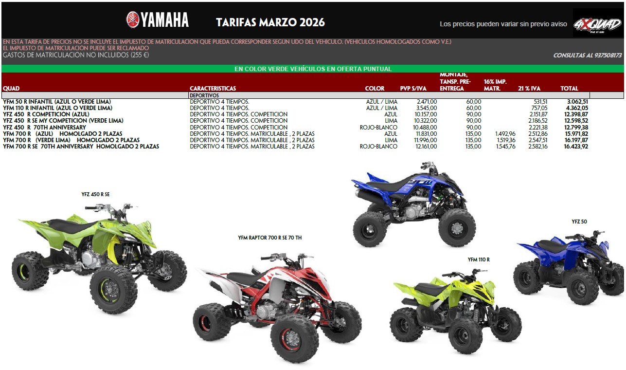 Aquí puedes ver el precio actualizado de los vehículos YAMAHA. Recordamos que en la tarifa de precios no está incluido el impuesto de matriculación COMO VEHÍCULO ESPECIAL (PLACA VE) que puede ser reclamado según el uso del vehículo en alguna comunidad o delegación de hacienda. Solo incluimos el impuesto en los quads deportivos que no cumplen los requisitos de Vehículo Agrícola.